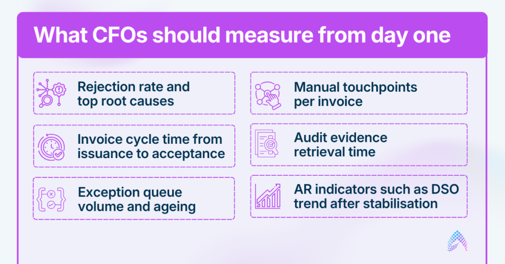 These metrics show whether e-invoicing is becoming a controlled workflow or a recurring fire drill.